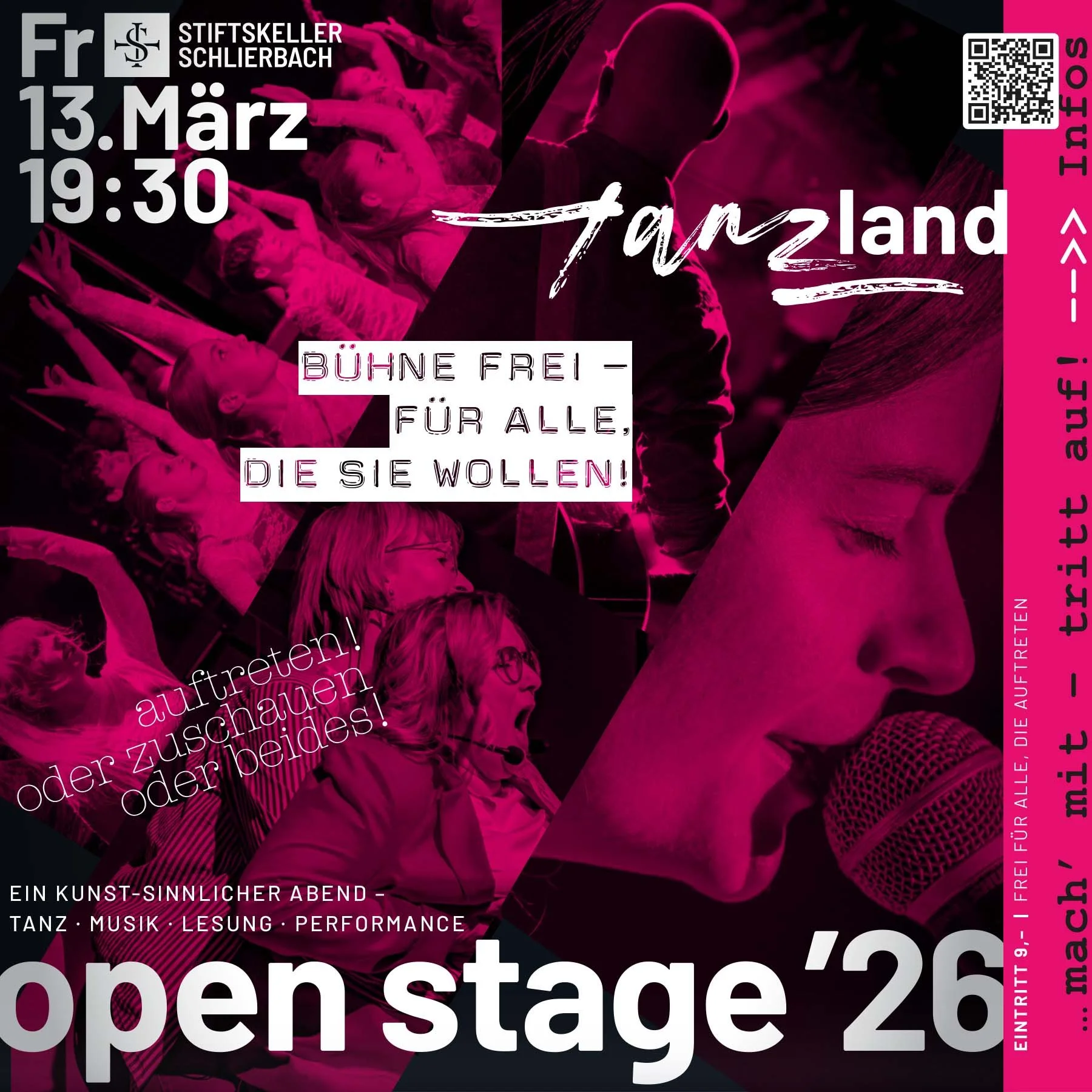 “Kunst braucht Publikum! Aber genau dieser erste Schritt aus der Komfortzone, in die Öffentlichkeit ist für junge KünstlerInnen mitunter einer der schwierigsten, geprägt von Selbstzweifeln und Unsicherheit. Die offene Bühne schafft hier Abhilfe: Ungefähr eineinhalb Stunden lang wird getrommelt und getanzt, gerappt und gelesen – weder die künstlerische Sparte noch die Stufe der kreativen Entwicklung spielen dabei eine Rolle. So verschieden die Beiträge auch sind, gleich ist allen die großartige Atmosphäre, in der sie vorgetragen werden dürfen. Frenetischer Jubel inbegriffen!”